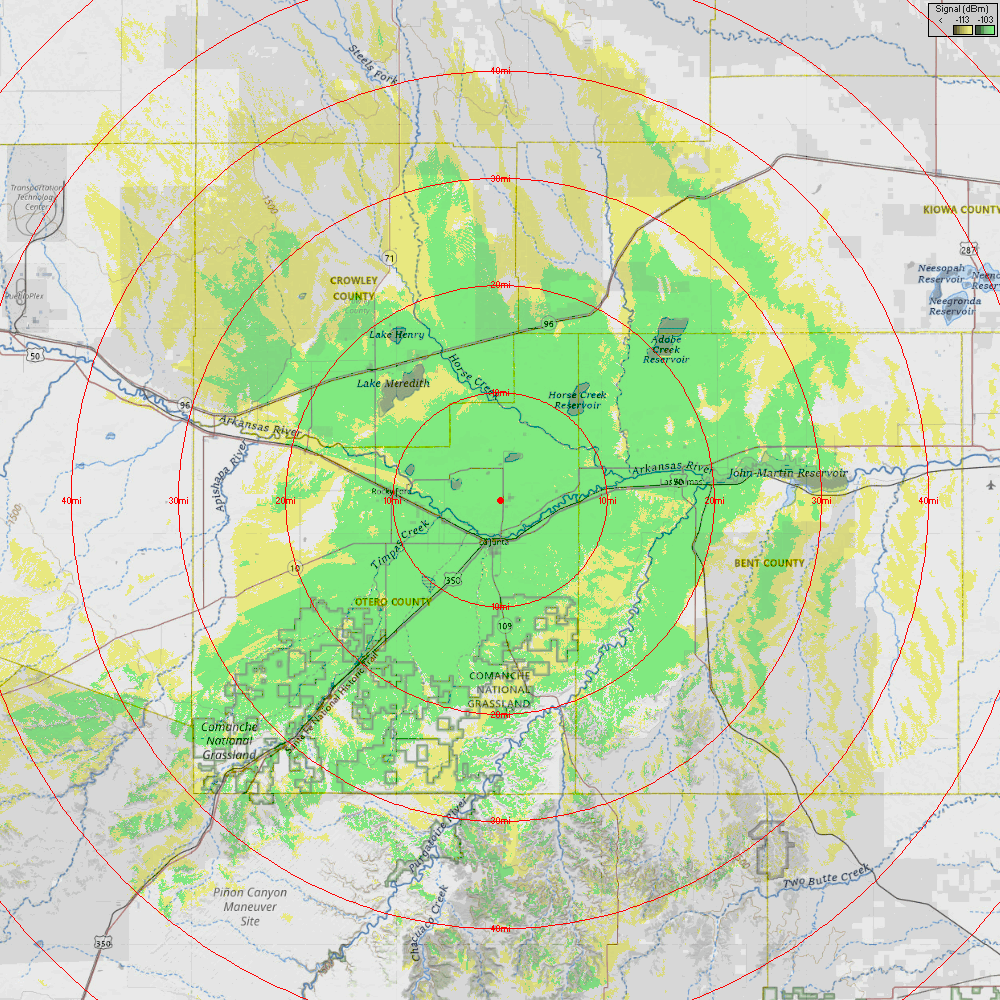The La Junta, CO site is located at Airbase Hill (also known by the locals as the “Boys Ranch Hill”) near the La Junta Airport. RMHAM operates a low power “spot fill” repeater at this location. Power output is 30W and the antenna is mounted low on the south side of the tower to focus on filling the the Arkansas River Valley directly around La Junta. As can be seen in the coverage plot, coverage is approximately a 20 mile radius of the site.